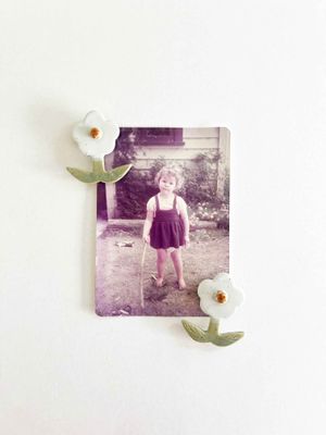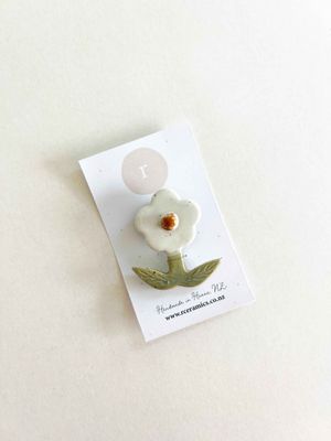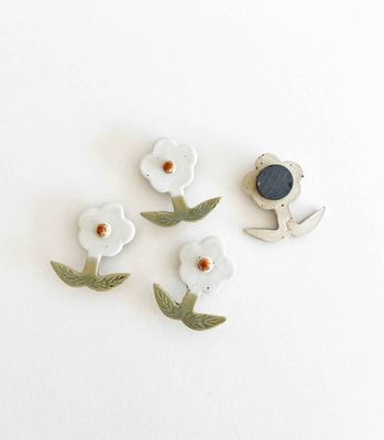 Pretty up your fridge with flowers. Hand-built with a cream speckle stoneware clay, carved and finished in a beautiful white gloss, sage green and cinnamon glaze. Each magnet comes packaged attached to a card in a plastic sleeve.