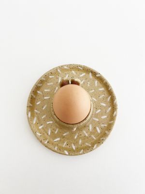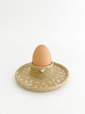 Wheel thrown in a speckle stoneware clay, with hand-built features, underglaze and finished off with a clear glaze, this little egg cup is sure to bring joy to those that use it.