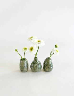 Hand-sculpted in a speckle stoneware clay & glazed in a beautiful glossy green, these mini vases would make the cutest addition to any shelf in your home. Pick your tiny flowers and have fun arranging!