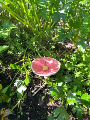 Hand-built with a cream speckle clay, carved, then under glazed in a cerise pink and buttercup yellow, this little bee cup is a perfect addition to your garden in summer... a place for bees to safely stop, drink the water they need, and rest without drowning.