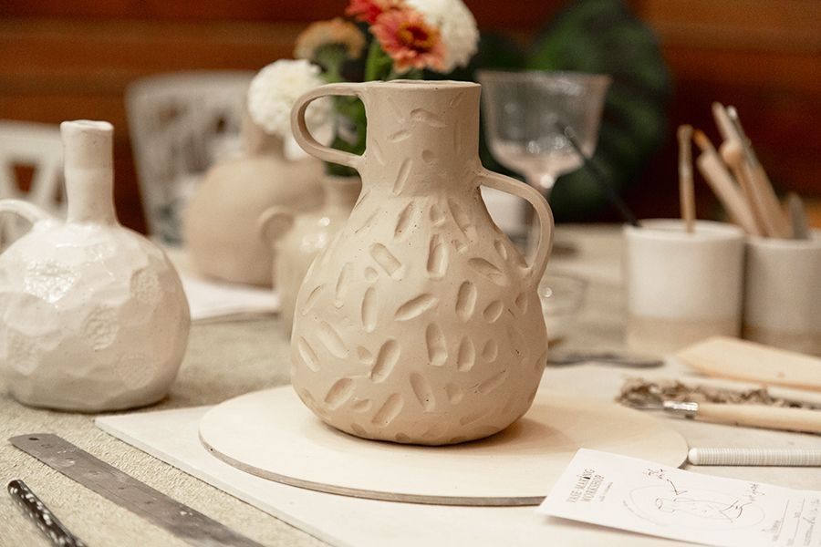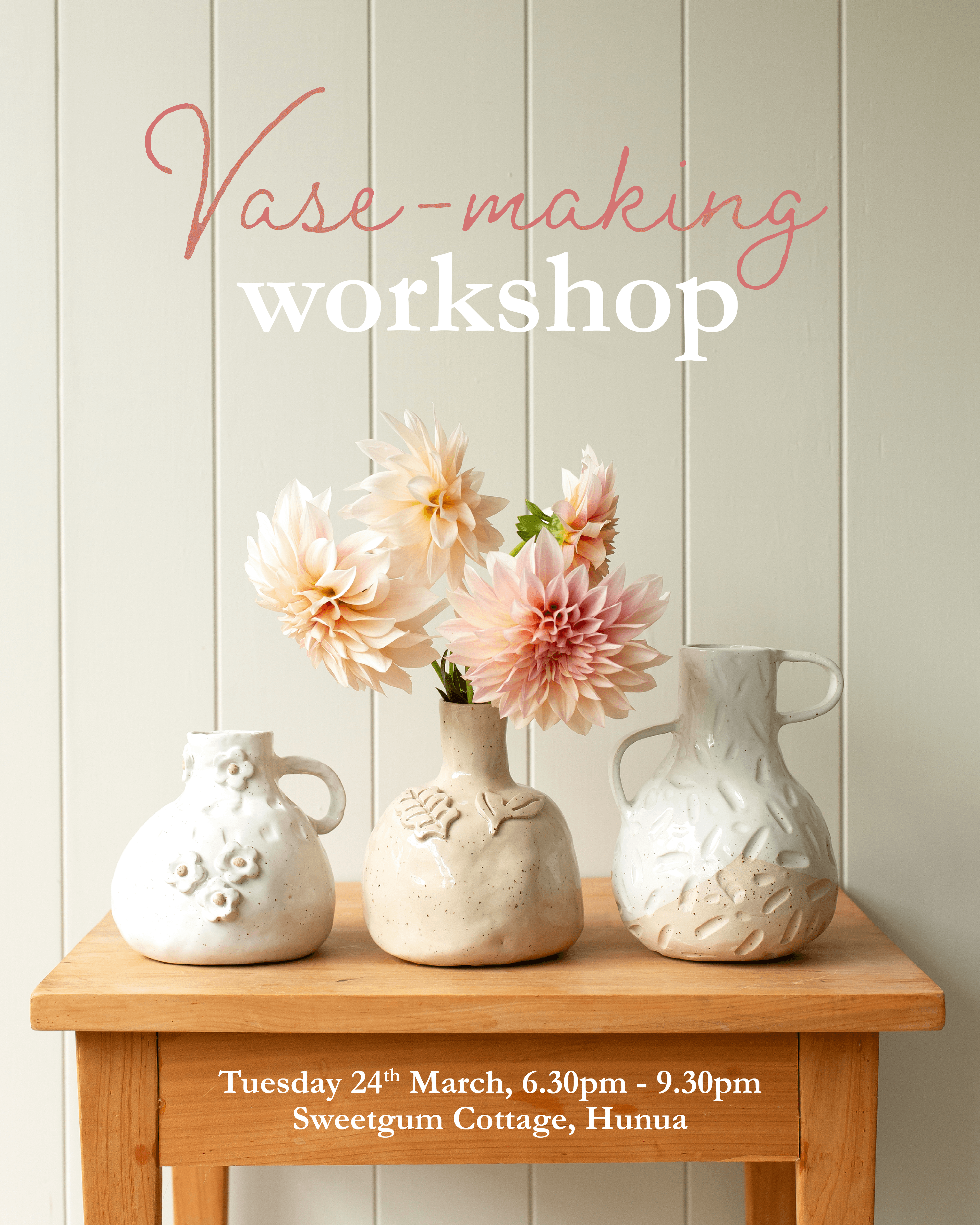 In this workshop held at Lynda Hallinan's exquisite Sweetgum Cottage & Garden, Bex will begin with a demonstration of how to make a vase using basic pottery hand-building pinch techniques. You’ll then go through the process with her support, creating a vase designed and decorated by you.