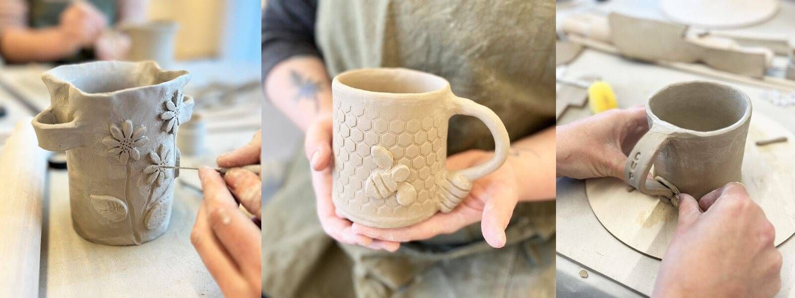 In this 2.5hr creative pottery workshop, Bex will begin with a brief demonstration of how to make a mug using basic pottery hand-building slab techniques. You’ll then go through the process with her support, creating a mug designed and decorated by you.